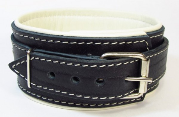 Снаружи ошей­ник выполнен из натуральной толстой ременной кожи черного цвета, декорирован контрастной грубой строчкой бежевого цвета, выглядит невероятно провокационно, как на нежной женской шейке, так и на мужской!