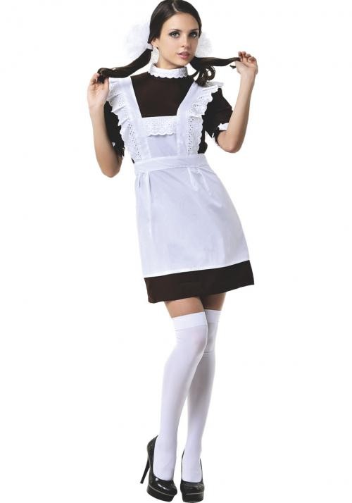 Комплект состоит из клас­си­че­ского корич­не­вого пла­тья с белым ворот­нич­ком и бело­снеж­ного фартука!